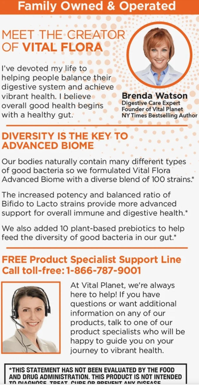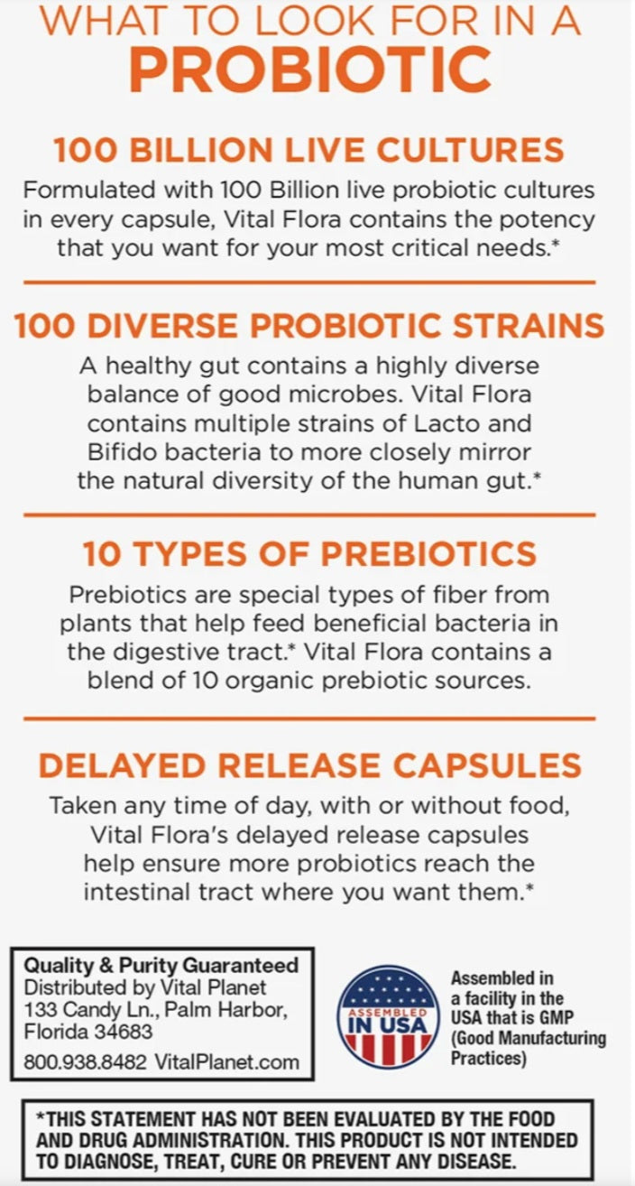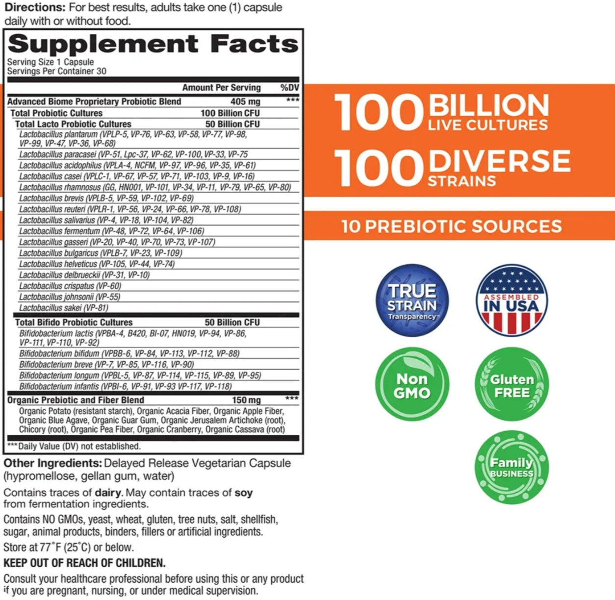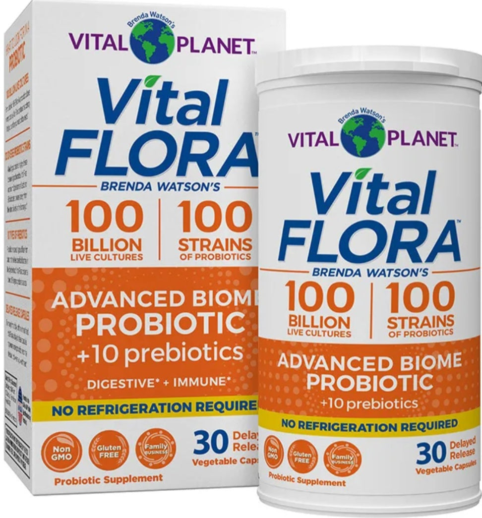 Vital Flora Advanced Biome Probiotic is formulated with 100 billion cultures and 100 strains per capsule for those seeking a higher potency and higher diversity formula.